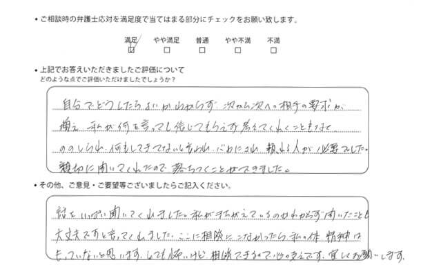 自分でどうしたらよいかわからず、次から次へ相手の要求が増え、私が何を言っても信じてもらえず考えてくれることもなくののしられ、何もしてきてないと追われ、バカにされ、頼れる人が必要でした。親切に聞いてくれたので落ち着くことができました。